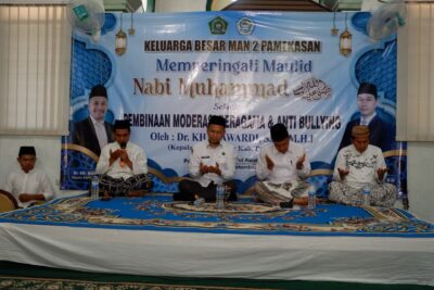PAMEKASAN – Suasana khidmat menyelimuti Masjid Al-Ishlah MAN 2 Pamekasan (M2P) pada Selasa 16 September 2025, saat seluruh warga madrasah berkumpul untuk merayakan Maulid Nabi Muhammad SAW. Acara ini bukan sekadar peringatan hari kelahiran, melainkan momentum untuk menguatkan nilai-nilai toleransi, moderasi beragama, dan anti-bullying di kalangan siswa, guru, dan staf.